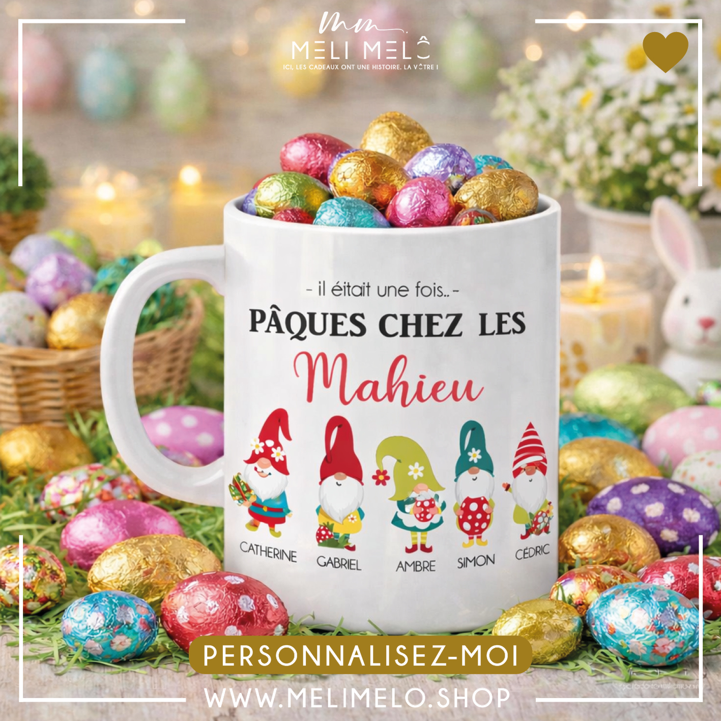 Cette année, pour Pâques, faites le choix d’un cadeau unique et original avec un mug personnalisé! Et pourquoi ne pas y glisser quelques œufs en chocolat? Pour que chaque pause café vous rappelle combien le bonheur se crée en famille, découvrez notre mug personnalisable!